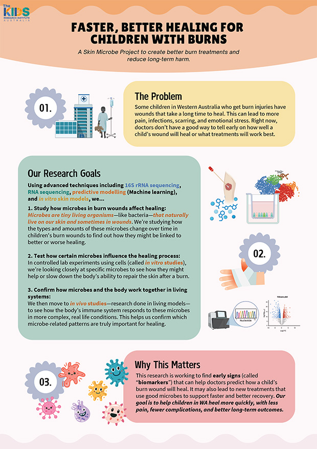 Burn injuries remain a significant and increasing health burden in Australia and worldwide. While survival rates have significantly improved, healing outcomes remain unpredictable and challenging for clinicians. Many patients experience poor healing outcomes, mobility issues, scarring and life-long complications. Particularly, in young children their scars do not stretch as they grow, potentially requiring ongoing surgery, placing a lifelong burden on families and health systems.